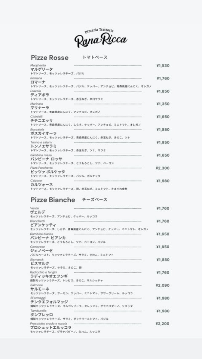 | 店舗名 | Pizzeria Trattoria Rana Ricca |